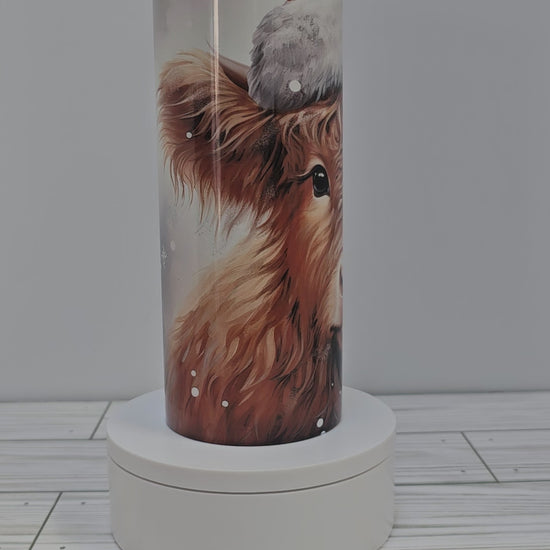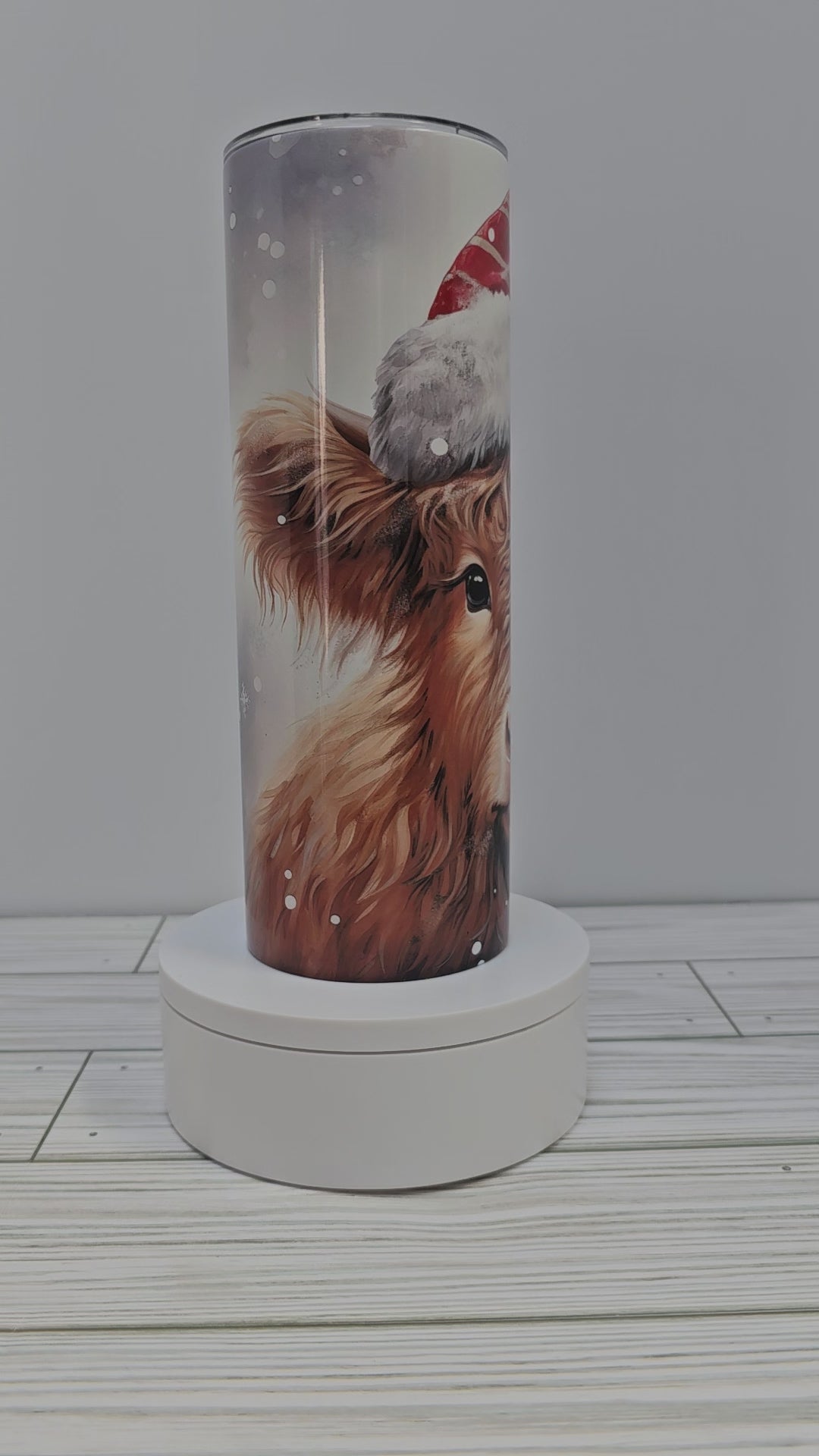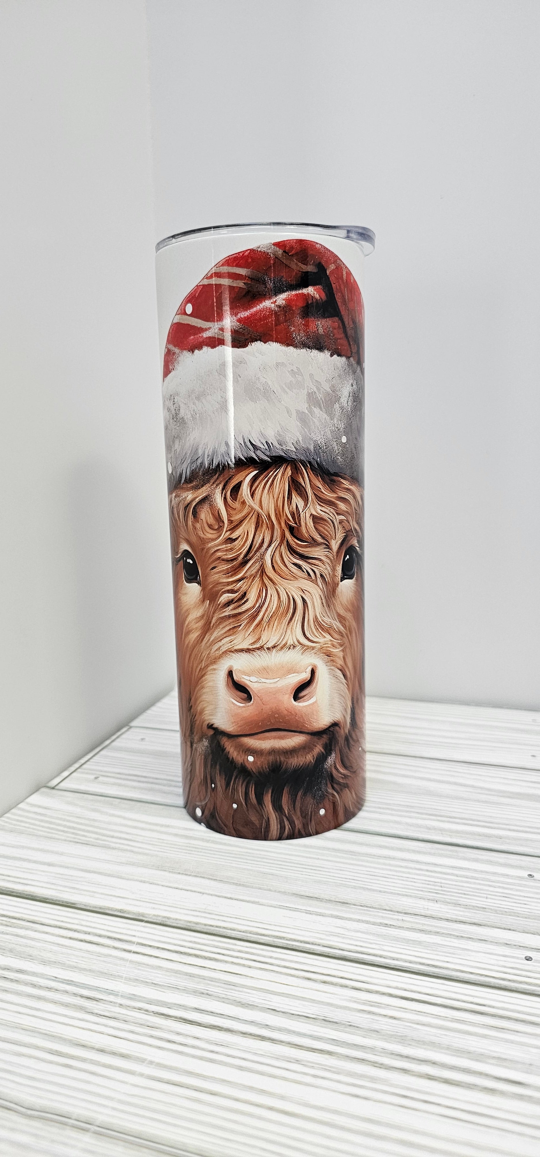 Steel 20oz tumbler with a cow in a Santa hat on it.